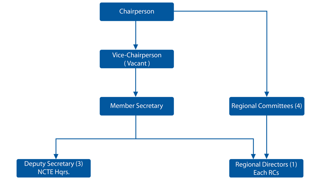 National Council for Teacher Education has its headquarter at New Delhi and four Regional Committee i.e. NRC,SRC,WRC and ERC situated at New Delhi to look after its statutory responsibilities. In order to enable the National Council for Teacher Education to perform the assigned functions including planned and co-ordinated development and initiating innovations in teacher education, the NCTE in Delhi as well as its four Regional Committee have administrative and academic wings to deal respectively with finance, establishment and legal matters and with research, policy planning, monitoring, curriculum, innovations, co-ordination, library and documentation, in service programs. The NCTE is headed by the Chairperson, NCTE.